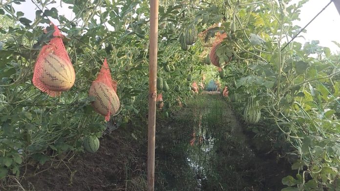 চট্টগ্রামের সাতকানিয়া উপজেলার ছদাহা র্খোদ্দ কেঁওচিয়া এলাকায় বারোমাসি তরমুজ চাষে সাফল্য পেয়েছেন স্থানীয় কৃষকরা। কম সময়ে বেশি লাভ হওয়ায় দিনদিন বাড়ছে কৃষকদের আগ্রহ এই চাষে। সরজমিনে দেখা গেছে মাঠে মাচায় ঝুলছে লাল-সবুজ রসালো তরমুজ। তরমুজগুলো যাতে পড়ে না যায়, এজন্য ব্যবহার করা হয়েছে বিশেষ নেট ব্যাগ। কৃষকরা জানিয়েছেন, সাতকানিয়া উপজেলা কৃষি অধিদপ্তরের পরামর্শে তারা মাঠে কাজ করছেন।