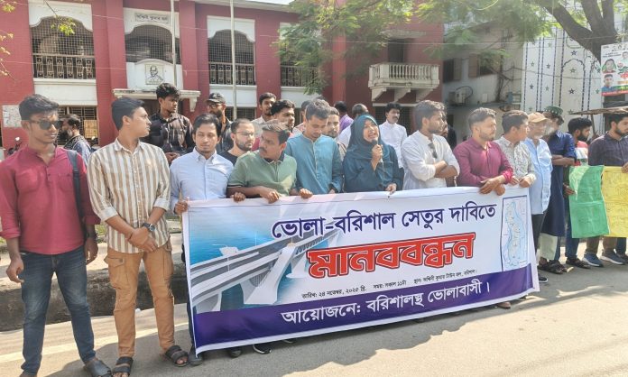 বরিশাল : ভোলা-বরিশাল সেতুর দাবীতে বরিশালে মানববন্ধন অনুষ্ঠিত হয়েছে। সোমবার বেলা সাড়ে ১১টায় নগরীর সদর রোডস্থ অশ্বিনী কুমার হলের সামনে এ মানববন্ধন অনুষ্ঠিত হয়।