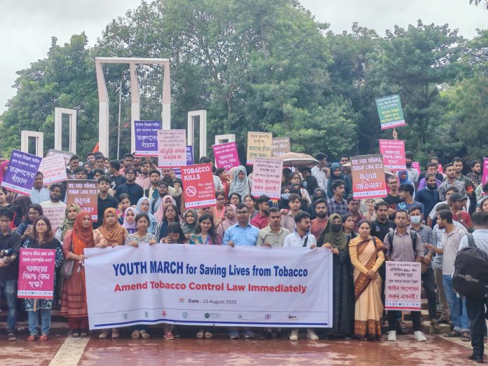 তামাক নিয়ন্ত্রণ আইন সংশোধনে তামাক কোম্পানির সাথে বৈঠকের সিদ্ধান্ত বাতিল এবং তরুণ প্রজন্মকে তামাকের ছোবল থেকে সুরক্ষায় অবিলম্বে আইনের খসড়া সংশোধনী পাসের দাবিতে ‘ইয়ুথ মার্চ’ অনুষ্ঠিত হয়েছে। আজ ২৩ আগস্ট রাজধানীতে তামাকবিরোধী যুবসমাজের আয়োজনে কর্মসূচিটি কেন্দ্রীয় শহীদ মিনার থেকে শুরু হয়ে শাহবাগে এসে শেষ হয়। কর্মসূচি উদ্বোধন ও স্বাগত বক্তব্য প্রদান করেন বিশিষ্ট অর্থনীতিবিদ ও সাবেক তত্ত্বাবধায়ক সরকারের উপদেষ্টা ড. হোসেন জিল্লুর রহমান। তিনি বলেন, “তামাক যে ক্ষতিকর তা বৈজ্ঞানিকভাবে প্রমাণিত। আজকে তামাক নিয়ন্ত্রণ আইন সংশোধনের দাবিতে এখানে সমবেত হওয়া তরুণদের সাথে আমি একাত্মতা প্রকাশ করছি।”