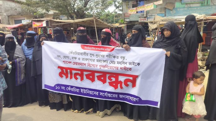 এসময় এলাকাবাসীর পক্ষ থেকে সাধারণ জনগণ বলেন, (৫ আগস্ট) পরবর্তী কেঁওচিয়া ইউপি চেয়ারম্যান উত্তর সাতকানিয়া যুবলীগের সাধারণ সম্পাদক ওসমান আলী এলাকা ছাড়লে বিভিন্ন সনদ-ভাতা সহ স্থানীয় সরকার ও গ্রাম আদালতের নানা অধিকার থেকে বঞ্চিত হয় কেঁওচিয়া ইউনিয়নবাসী। এমতাবস্থায় প্যানেল চেয়ারম্যান হিসেবে ইউনিয়নের নাগরিক সেবা নিশ্চিতকরণে উপজেলা প্রশাসন পক্ষ থেকে মহসিনকে দায়িত্ব প্রদান করে। দায়িত্ব পাওয়ার পর থেকে তিনি শতভাগ সততা ও নিষ্ঠার সাথে দায়িত্ব পালন করে যাচ্ছে। তার সততা দেখে কিছু কুচক্রি মহল তার বিরুদ্ধে ফেসবুকসহ নানা মাধ্যমে মিথ্যা, ভিত্তিহীন, বানোয়াট ও মনগড়া অপ-প্রচার চালিয়ে যাচ্ছে। আমরা আজকের এই মানববন্ধন থেকে প্রশাসনে কাছে জোরদাবি জানায় মোঃ মহসিনকে ভারপ্রাপ্ত চেয়ারম্যান হিসেবে পুনর্বহাল করা হোক।