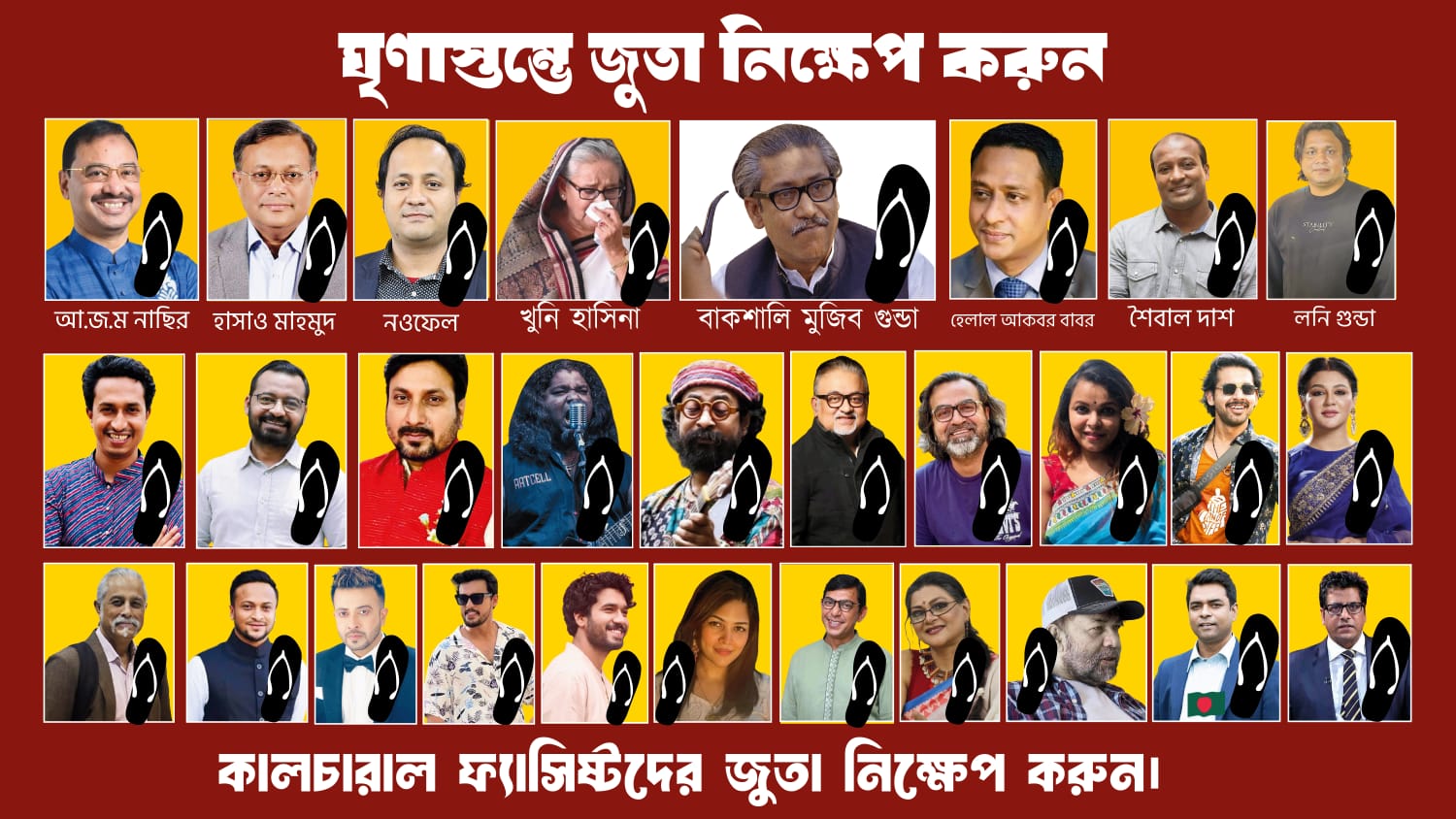 যাদের নাম ও ছবিতে জুতা সংযুক্ত ব্যানারে জুতা নিক্ষেপ কর্মসূচি পালন করে তাদের মধ্যে উল্লেখ যোগ্যরা হলেন, চট্টগ্রাম নগর আওয়ামী লীগের সাধারণ সম্পাদক আ জ ম নাছির উদ্দিন,সাবেক পররাষ্ট্র মন্ত্রী ড.হাসান মাহমুদ,সাবেক শিক্ষা মন্ত্রী মহিবুল হাসান চৌধুরী নওফেল,সাবেক প্রধানমন্ত্রী শেখ হাসিনা ও তার পিতা মরহুম জাতীয় নেতা শেখ মুজিবুর রহমান,সাবেক আওয়ামী যুবলীগের কেন্দ্রীয় উপ অর্থ সম্পাদক ও চট্টগ্রাম মহানগর আওয়ামীলীগ নেতা হেলাল আকবর চৌধুরী বাবর,সাবেক চসিক কাউন্সিল শৈবাল দাশ সুমন,সাবেক নগর ছাত্রলীগের সভাপতি নুরুল আজম রনি,জাতীয় ক্রিকেট দলের আলোচিত ক্রিকেটার ও সাবেক এমপি সাকিব আল হাসান,চিত্র নায়ক শাকিব খান,অভিনেতা চঞ্চল চৌধুরী,ব্যান্ড শিল্পী জেমস, সাংবাদিক আব্দুর নুর তুষার,সাংবাদিক জ ই মামুন,অভিনেত্রী মেহের আফরোজ শাওন ও অভিনেত্রী জয়া আহসান সহ মোট ২৯ জনের ছবি ও নাম ব্যবহার করে তৈরিকৃত এই আক্ষেপ ব্যানারে ঘৃণা জানানো হয়।