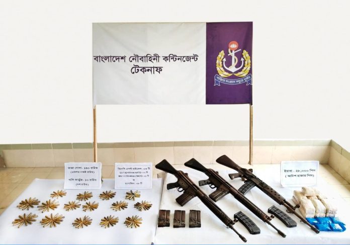 নৌবাহিনী কন্টিনজেন্ট কক্সবাজারের টেকনাফ উপজেলায় বিশেষ অভিযান পরিচালনা করে বিপুল পরিমাণ ইয়াবা, বিদেশি আগ্নেয়াস্ত্র ও গোলাবারুদ উদ্ধার করেছে।