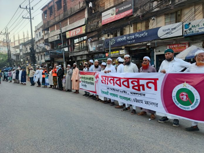পিআর পদ্ধতিতে জাতীয় সংসদ নির্বাচনসহ জনগণের অধিকার প্রতিষ্ঠার লক্ষ্যে পাঁচ দফা দাবিতে ইসলামী আন্দোলন বাংলাদেশ চট্টগ্রাম মহানগরের উদ্যোগে মানববন্ধন অনুষ্ঠিত হয়েছে।