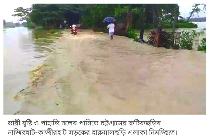 মোঃ এমরান হোসেন,ফটিকছড়ি (চট্টগ্রাম) প্রতিনিধি : কয়েকদিনের ভারি বৃষ্টি ও পাহাড়ী ঢলে চট্টগ্রামের ফটিকছড়ির বিভিন্ন নিন্মঞ্চল প্লাবিত হবার খবর পাওয়া গেছে। প্লাবিত এলাকার ফসলের ক্ষেতসহ ডুবে গেছে বহু গ্রামীন রাস্তাঘাট, মৎস খামার। এতে ওই অঞ্চলের মানুষরা চরম দুর্ভোগে পড়েছেন। এদিকে রবিবার বেলা ২টায় হালদা নদী পানি বিপদ সীমার কাছাকাছি বলে মুঠো ফোনে জানিয়েছেন চট্টগ্রাম পানি উন্নয়ন বোর্ডের হাইড্রোলজির দায়িত্বে থাকা আরিফা নাজনিন। তিনি বলেন- ভারি বৃষ্টিপাত অব্যাহৃত থাকলে হালদা নদীর পানি বিপদ সীমানা অতিক্রম করবে।
