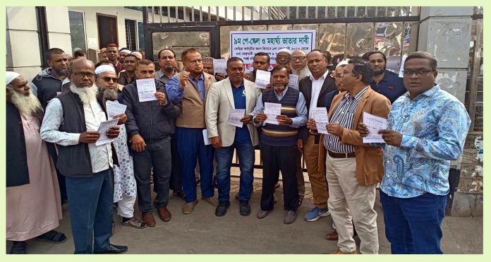 পে-কমিশনের সুপারিশ করা বৈষম্যহীন নবম পে-স্কেলসহ ৭ দফা দাবি বাস্তবায়নের দাবিতে বরিশাল সিটি করপোরেশনের (বিসিসি) গেটে অবস্থান ও বিক্ষোভ করেছেন সেখানকার কর্মচারীরা।